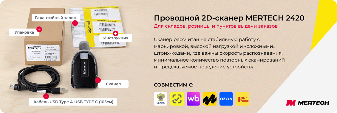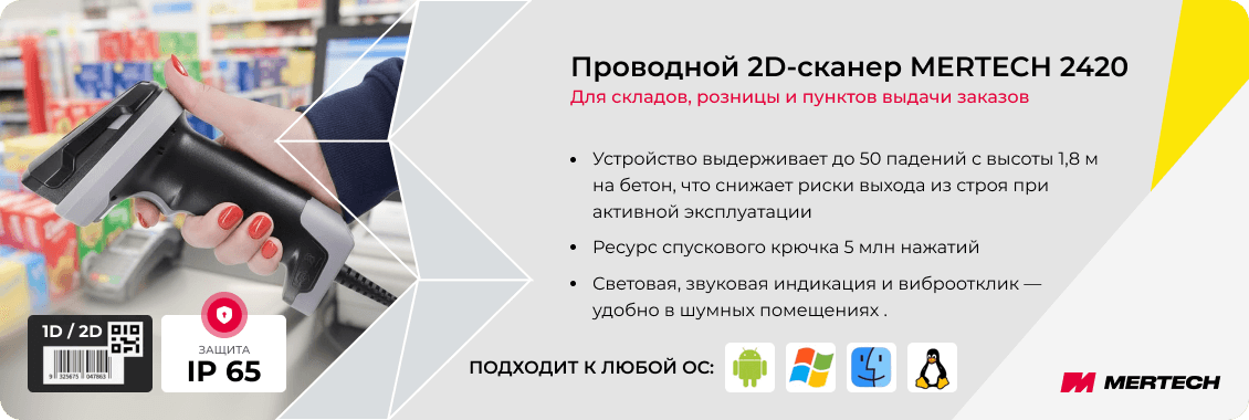 MERTECH 2420 P2D используется в розничных магазинах, аптеках, на складах, в пунктах выдачи заказов и зонах приёмки. Сканер совместим с популярными кассовыми и товароучётными системами, включая 1С, СБИС и ЭВОТОР, и легко интегрируется в существующую инфраструктуру.