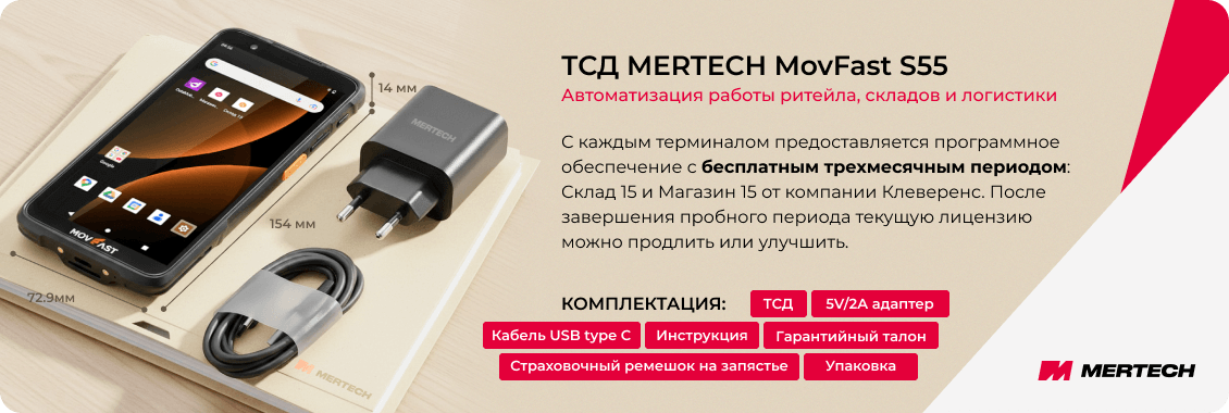 С каждым MERTECH MovFast S55 предоставляется программное обеспечение с бесплатным трехмесячным периодом: Склад 15 и Магазин 15 от компании Клеверенс. После завершения пробного периода текущую лицензию можно продлить или улучшить.